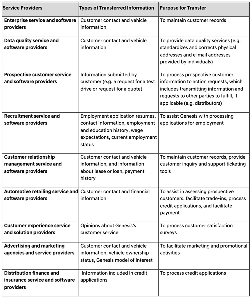 We may share your personal information with our dealers, affiliates, parent company and service providers for the purposes listed in this Privacy Notice. Genesis has agreements with its service providers to ensure they only use your personal information as needed to provide services to us or to you.